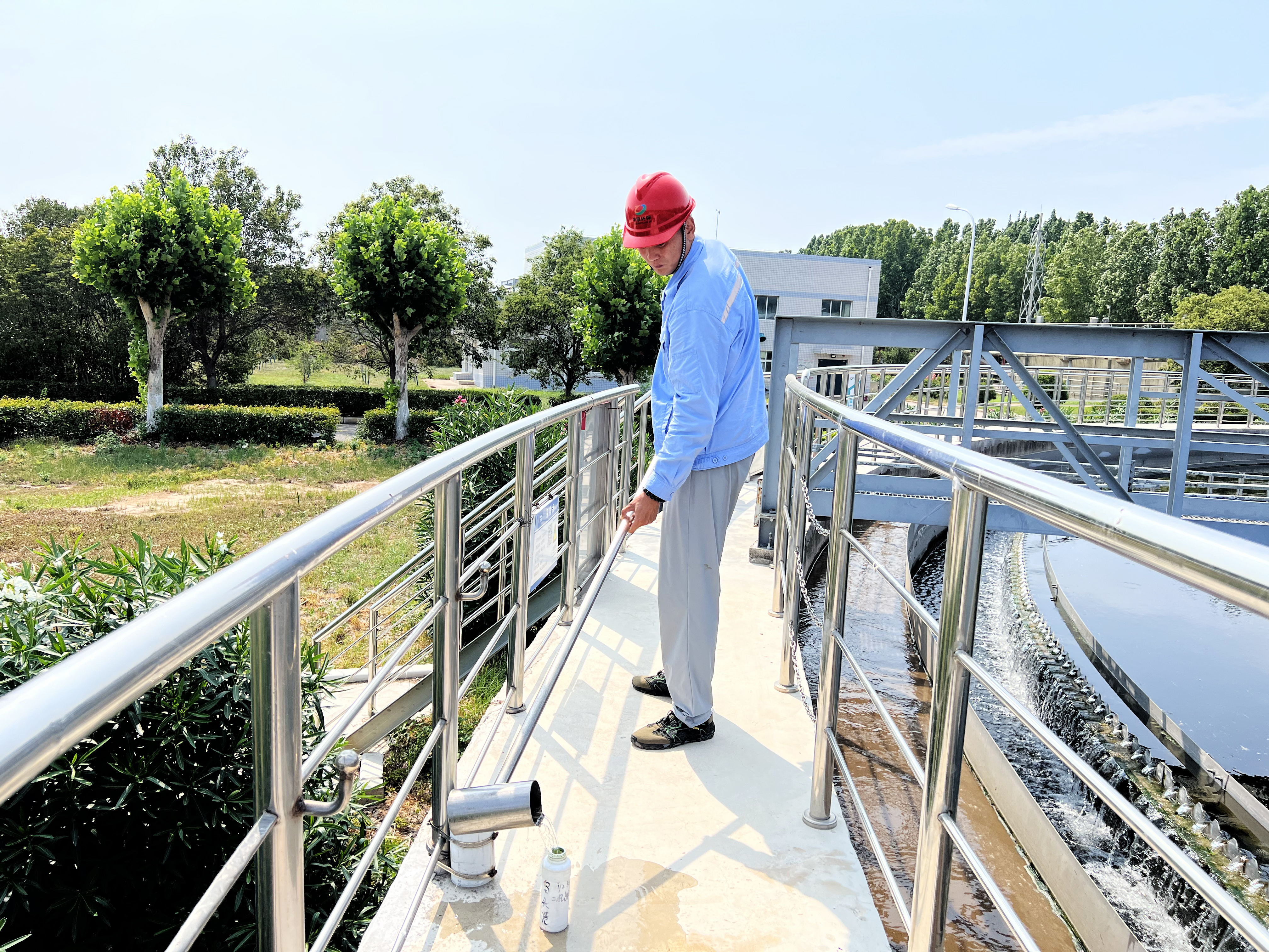 马头岗水务二沉池畔,水区运行管理中心班组人员顶着高温,正严格按照操作规程进行日常水质采样作业,确保采集样品能够真实地反映水质情况。